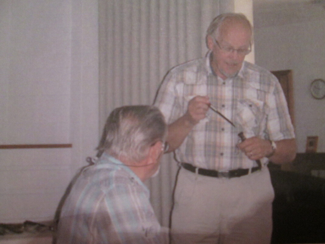 Arto Liukko esittelee tekemäänsä puukkoa Mauri Muhoselle.