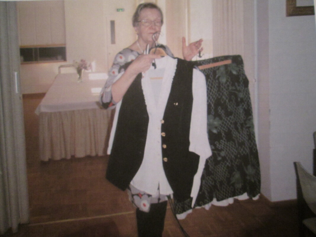 Eeva Töyry esittelee Haverittaren pukua, jota ei helteen vuoksi pukenut päälleen.