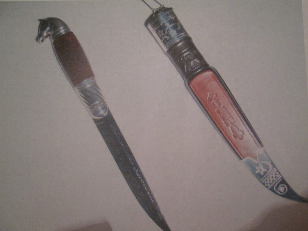Arto Liukon pojalleen Jarille tekemä puukko tupessaan. Tämä puukko on rautalampilainen korupuukko Emil Hännisen tyyliin.