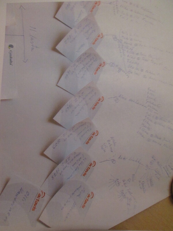 Eeva Töyryn tekemä pöydällä oleva fläppitaulu läsnäolevien sukulaisuussuhteista.