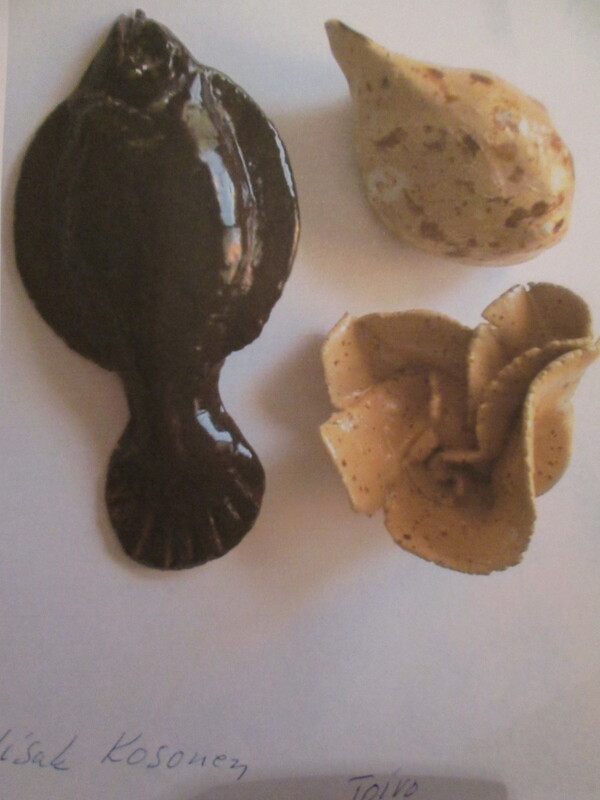 ![Aino Töyryn tekemä maalattu kipsikala ja Eeva Töyryn tekemä keramiikkasiili ja kukka.]()