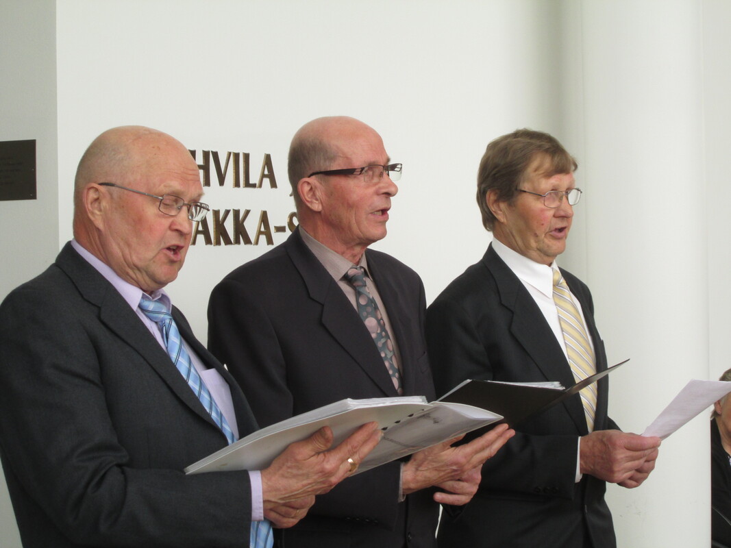 ![Sukuseuran perustamistilaisuudessa olleet Lauvuksen laulavat isäntämiehet Teuvo, Jouko ja Teppo Haverinen esiintymässä 4.5.2014 Liisa Haverisen 80-vuotisjuhlassa Kuhmo-talossa. (Kuva:Anupii)]()