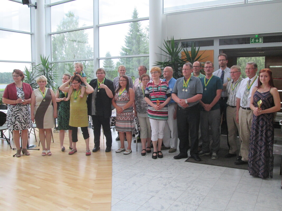 Haveristen tikka -ja kuulakisan mitalein palkitut kisavoittajat yhteispotretissa sukujuhlassa 30.7.2016 (Kuva:Anu Piironen)