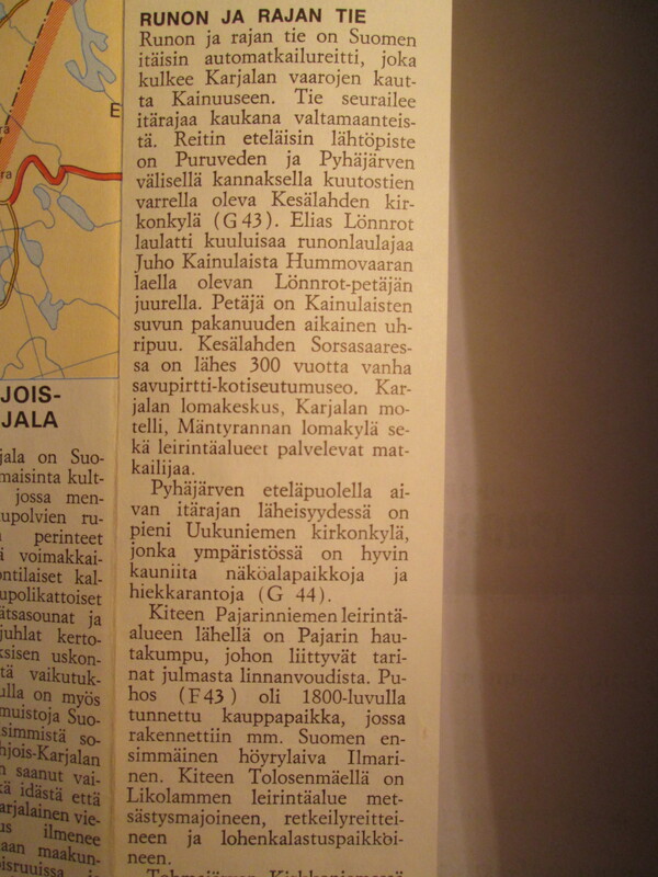 Valittujen Palojen Koko Perheen Autokirja vuodelta 1970 kertoo erikoisia asioita Runon ja Rajan tien varrelta, Kesälahdelta ja Kiteeltä. Koko perheen Autokirja kertoo Hummovaaran petäjän juurella Elias Lönnrotin laulattaneen runonlaulaja Juho Kainulaista. Karttakirjan infossa mainitaan petäjän olleen Kainulaisten suvun pakanuuden aikainen uhripuu. Kiteellä on myös Pajarin hautakumpu ja Autokirjan tieto kertoo julmasta linnanvoudista. Puhoksella on kirjan mukaan rakennettu ensimmäinen höyrylaiva Ilmarinen.(Karttakirjatekstin lyhennelmä, anupii) |