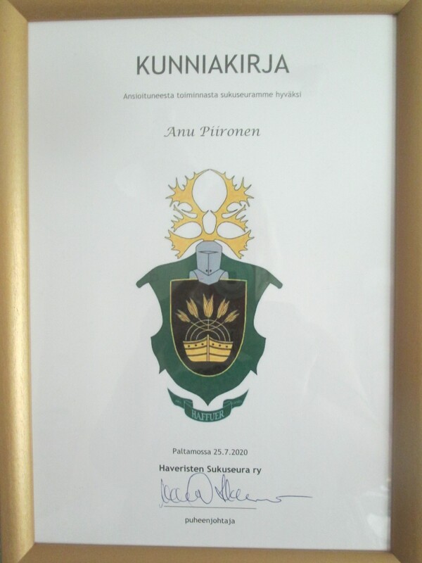 Haveristen sukuseura ry jakoi kunniakirjoja ja standaareja Kesäpäivilen iltajuhlassa 25.7.2020 aktiivisille sukuseuran toimijoille. Haveristen sukuseuran pöytästandaarit ja valmiiksi kehystetyt kunniakirjat saivat Kainuun opistolla järjestetyssä Haveristen sukuseura ry:n Kesäpäivien iltajuhlassa Veikko Haverinen, Martti Haverinen, Anu Piironen ja Martta Haverinen. Sukuseuran vaakunalippu standaarit ja kunniakirjat tulivat saajille ansioituneesta toiminnasta oman sukuseuransa hyväksi. Haveristen sukuseuran vaakunalogolla varustetun t-paidan saivat Marja-Leena Haverinen ja Terhi Haverinen/@nupii |