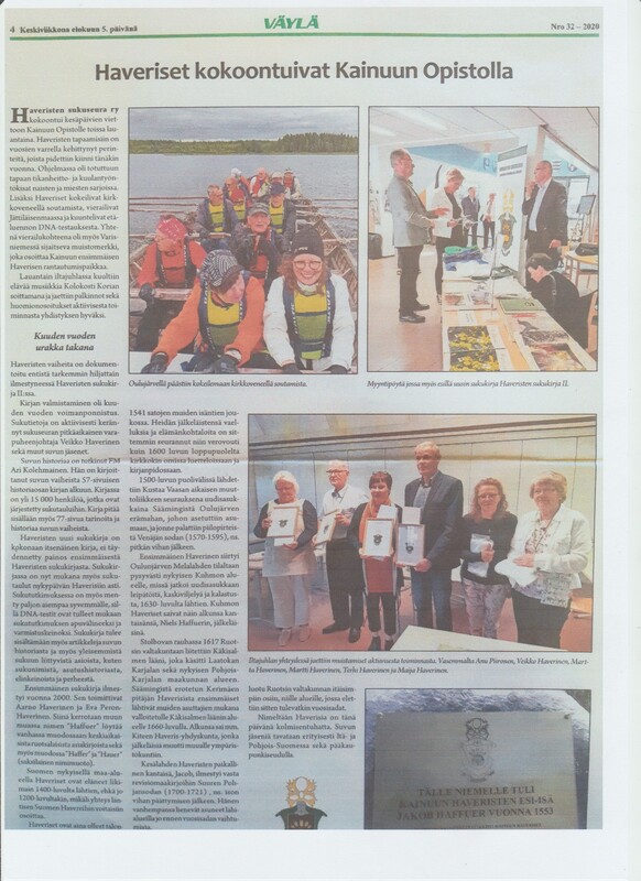Paltamon paikallislehti Väylän toimittaja Petri Möttönen on kirjoittanut artikkelin 5.8.2020 lehteen. Mielenkiintoisen jutun kirjoittaja soitti Kolokosti Koriasti-yhtyeen jäsenenä kontrabassoa Haveristen sukuseuran iltakonsertissa. Teksti ja kuvat: Anu Piironen Haveristen sukuseuran Kesäpäivät olivat Paltamossa 25.-26.7.2020. Paikalla piipahti myös Paltamon paikallislehti Väylän toimittaja Petri Möttönen. Hän oli iltakonsertissa osa konsertoivaa trioa kontrabasistina. Basson rinnalla kuultiin kanteletta ja laulua. Paltamossa kuultiin kansanmusiikin ohella Paltaniemen Hövelissä syntyneen Eino Leinon runoihin sävellettyjä kappaleita, hieman iltakonserttiin sovitettuina ja ainutkertaisen makuisina. Nocturne ja Aurinkolaulu soivat runojen tunnetasoihin herkkyydellä solahtaneen laulajan äänellä, kontrabasson tuodessa tummempia sävyjä laulun ja kanteleen heleän soinnin rinnalle. Leino-tulkintojen lomaan sopivat myös monet suomalaisille rakkaat kesäiset, traditionaaliset kansanmusiikkisävellykset ja laulut. Yhteislauluillekin jäi aikaa Kolokosti Korian päättäessä ohjelmistonsa. Kari Tapion tunnetuksi tekemä, Olen suomalainen-kipale soi painokkaasti, Haveristen, soittajien ja esilaulajan päästessä yhteislaulun alkuun. Sekin kesätunnelmaa luoden.@p