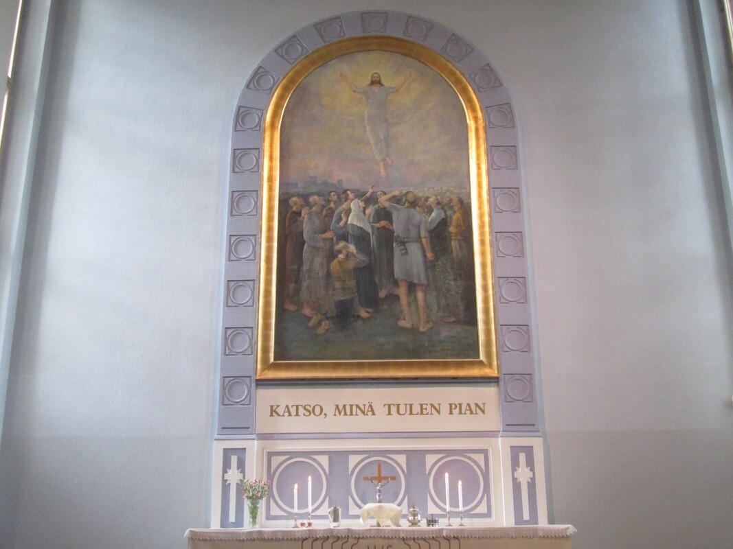 Haveristen sukuseuran Kesäpäiville tulleet osallistuivat Kainuunnopiston pihalla pidetyn seppeleenlaskun jälkeen ehtoollismessuun Paltamon kirkossa. Teksti ja kuvat: Anu Piironen Sunnuntai aamu 26.7.2020 Haveristen sukuseuran Kesäpäivillä, Kainuun opistolla Paltamossa oli sateinen. Sade kuitenkin taukosi ennen liljoista ja lippusinisistä krysanteemeista sidotun seppeleenlaskua. Haveristen sukuseura laski muistoseppeleen opiston takapihalla sijainneelle, Sotaan 1939 lähteneiden -muistomerkille. Seppelettä olivat laskemassa sukuseuran puheenjohtaja Mauno Haverinen ja varapuheenjohtaja Veikko Haverinen. Muistomerkillä laulettiin moniäänisesti virsi 170, Jumala ompi linnamme. Kainuun opistolta oli vuonna 1946 käyttöön vihittyyn Paltamon kirkkoon, Puolangantielle matkaa 8,7 km ja pilvisen aamun kirkkomatka sujui kimppakyydeillä. Kolmilaivainen kirkko on arkkitehti Ilmari Launiksen (1881-1955) suunnittelema. Se on tiiliverhoiltu kirkko, jonka ulkopinnat on rapattu valkoiseksi. Kirkon alttari taulun on maalannut taidemaalari Toivo G.Tuhkanen (1877-1957). Maalauksessaan Tuhkanen kuvaa Kristuksen taivaaseenastumista. (Lähde: Paltamon kirkon kotisivut)