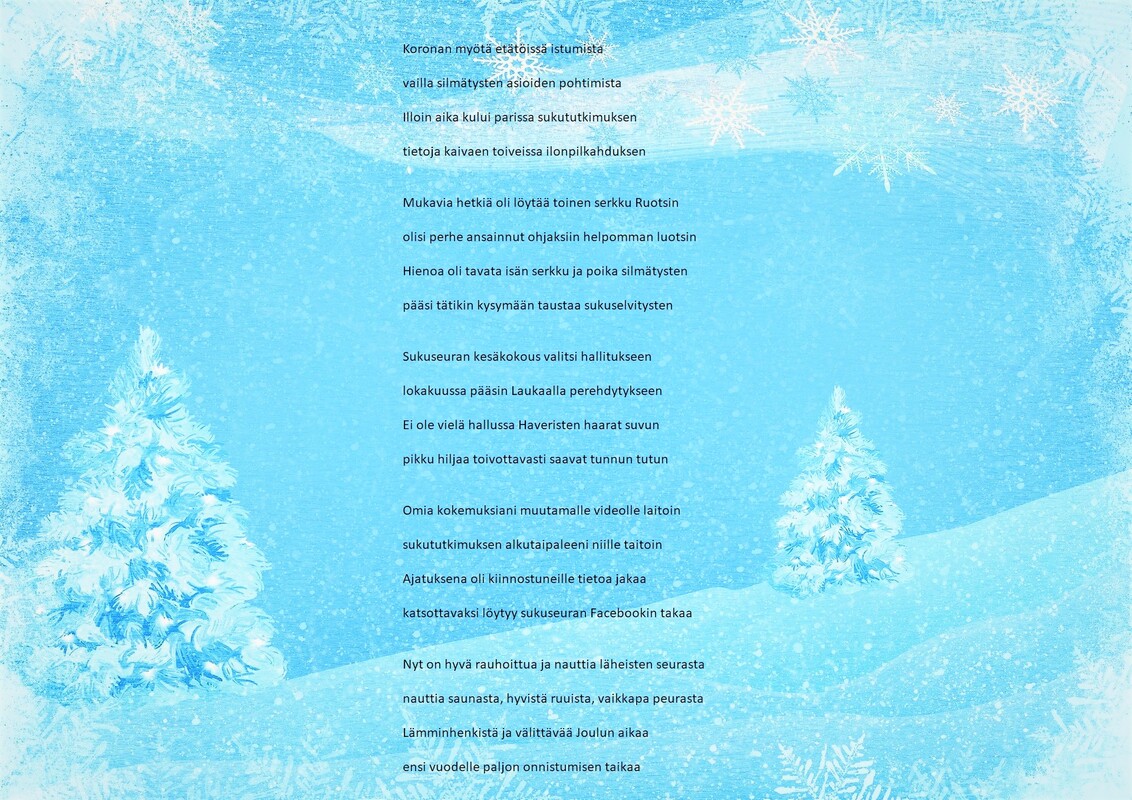 Tämän Haveristen sukuseuran varapuheenjohtajan runon myötä toivotamme kaikille rauhallista ja hyvää joulua Koronan myötä etätöissä istumista vailla silmätysten asioiden pohtimista Illoin aika kului parissa sukututkimuksen tietoja kaivaen toiveissa ilonpilkahduksen