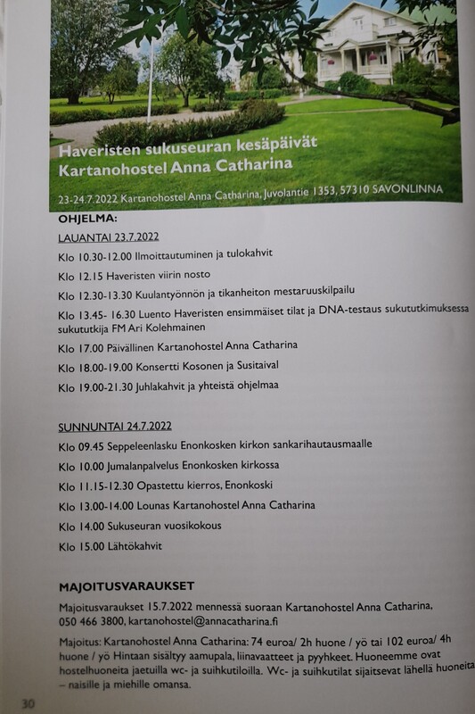 Haveristen sukuseuran kesäpäivät ovat ihan pian. Majoitusvarauksia ehtii vielä tekemään 15.7.2022 saakka. Jos ei pääse osallistumaan molempina päivinä, voi osallistua joko lauantaina tai sunnuntaina. Jos et pääse osallistumaan molempina päivinä, voit osallistua joko lauantaina tai sunnuntaina. Uskoisin, että järjestäjät toivovat suurta osallistujien määrää. Nyt kun se on vihdoinkin mahdollista koronarajoitus vuosien jälkeen.